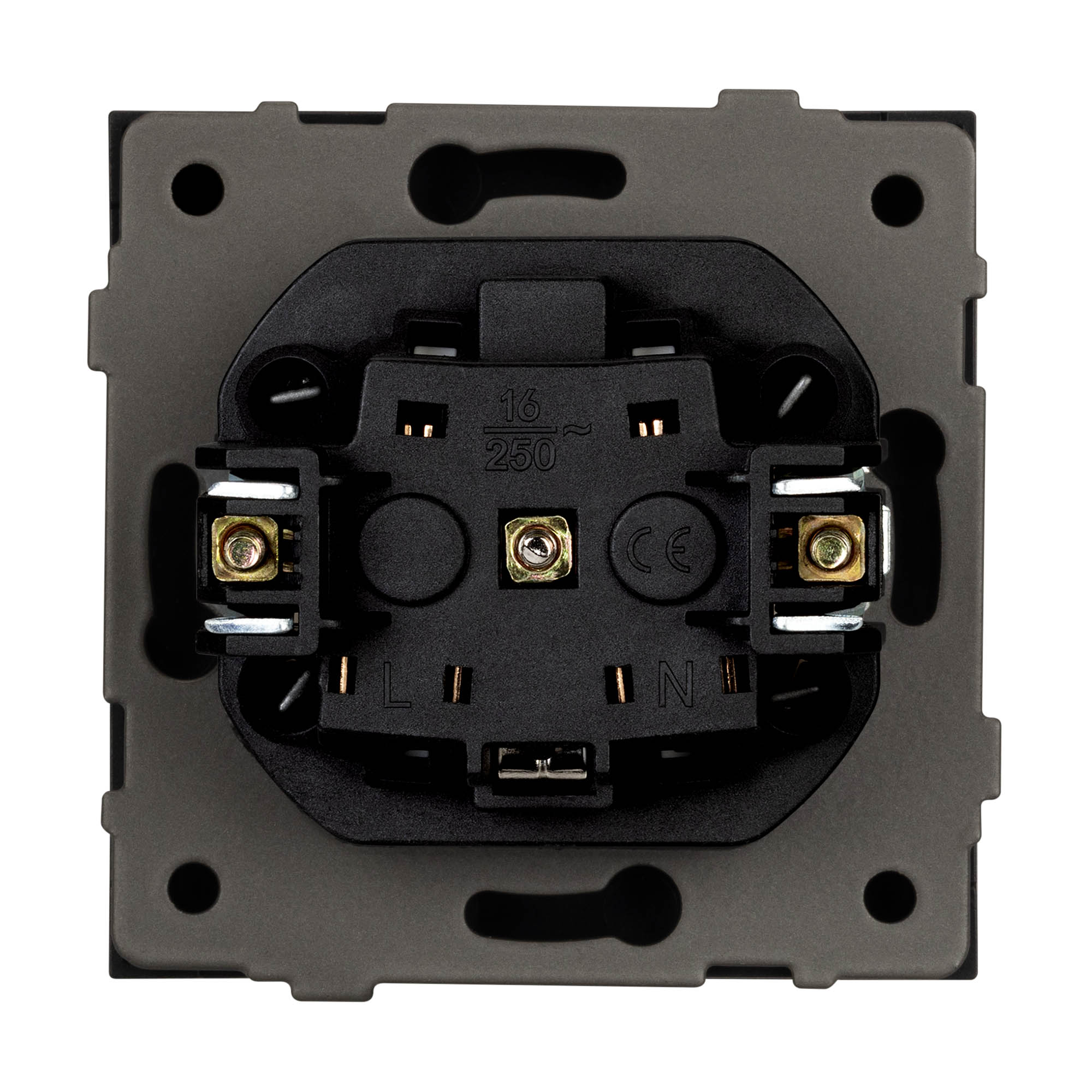 Механизм розетки с заземлением и влагозащитной крышкой на 1 пост. Цвет - серый, с Soft-Touch покрытием. Без фронтальной рамки. Уровень пылевлагозащиты IP44. Розетка устанавливается в стандартный подрозетник круглого сечения диаметром 60мм.