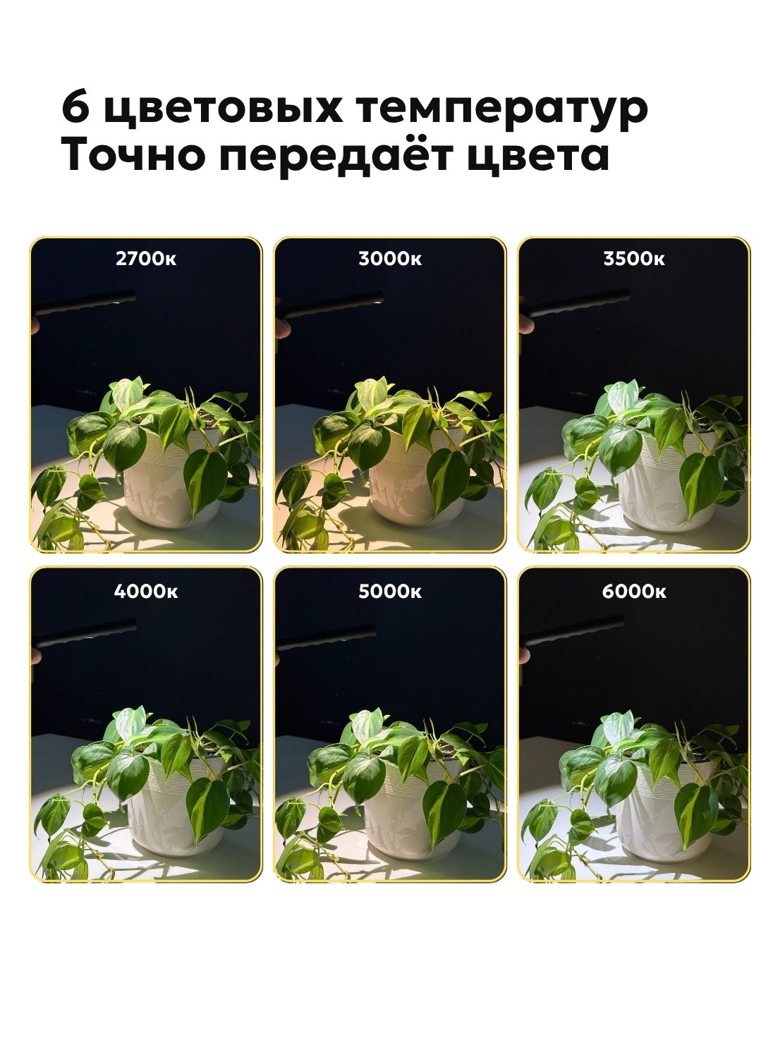 White | Белый 6000 K, Day | Дневной 5000 K, Day | Дневной 4000 K, Warm | Тёплый 3500 K, Warm | Тёплый 3000 K, Warm | Тёплый 2700 K |