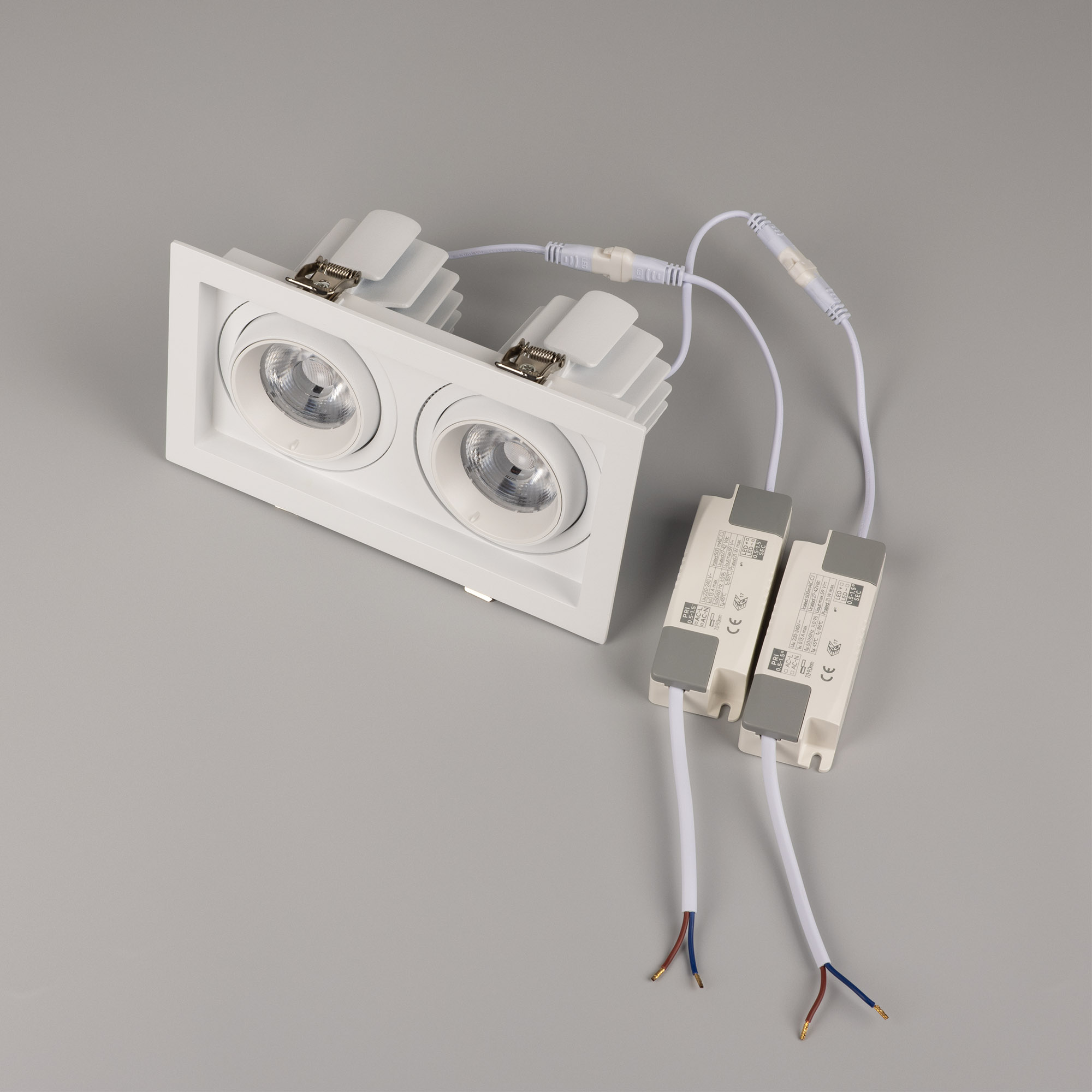 Встраиваемый карданный светильник. Мощность 2х20 Вт, св. поток 4264 лм, 106 лм/Вт, дневной 3000 K, CRI>92, угол 40°, напряжение питания 230 В. Белый корпус из алюминия, черная вставка, степень защиты IP20. Размер: длина 210 мм, ширина 117 мм, высота 105 мм. Монтаж встраиваемый, установочное отверстие: длина 190 мм, ширина 95 мм. Драйвер 24-42 В, 500 мА, пульсация <2%.